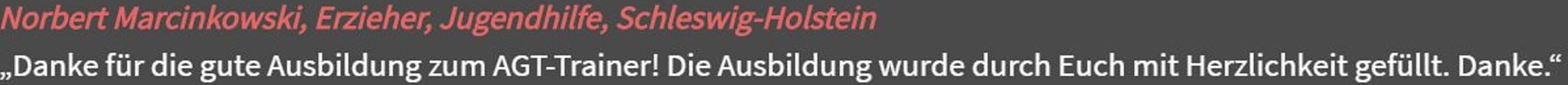 Basierend auf den langjährigen Erfahrungen aus ambulanten Anti-Gewalt-Trainings AGT-SH und AntiAggressionsTrainings AAT /CT® in Kiel bzw. Schleswig Holstein–, aus der Arbeit im präventiven Bereich an Schulen und Behörden sowie aus täterbezogenen Maßnahmen in Schleswig-Holsteins AGT-SH und Niedersachsen AAT/CT®-, wird aus diesem Grund durch unsere professionellen Dozenten die Weiterbildung zum zertifizierten Anti-Gewalt-Trainer (Deeskalationstrainer) seit über 25 Jahren angeboten und erfolgreich durchgeführt, sowie ständig weiterentwickelt bzw. mit aktuellen Themengebieten ergänzt